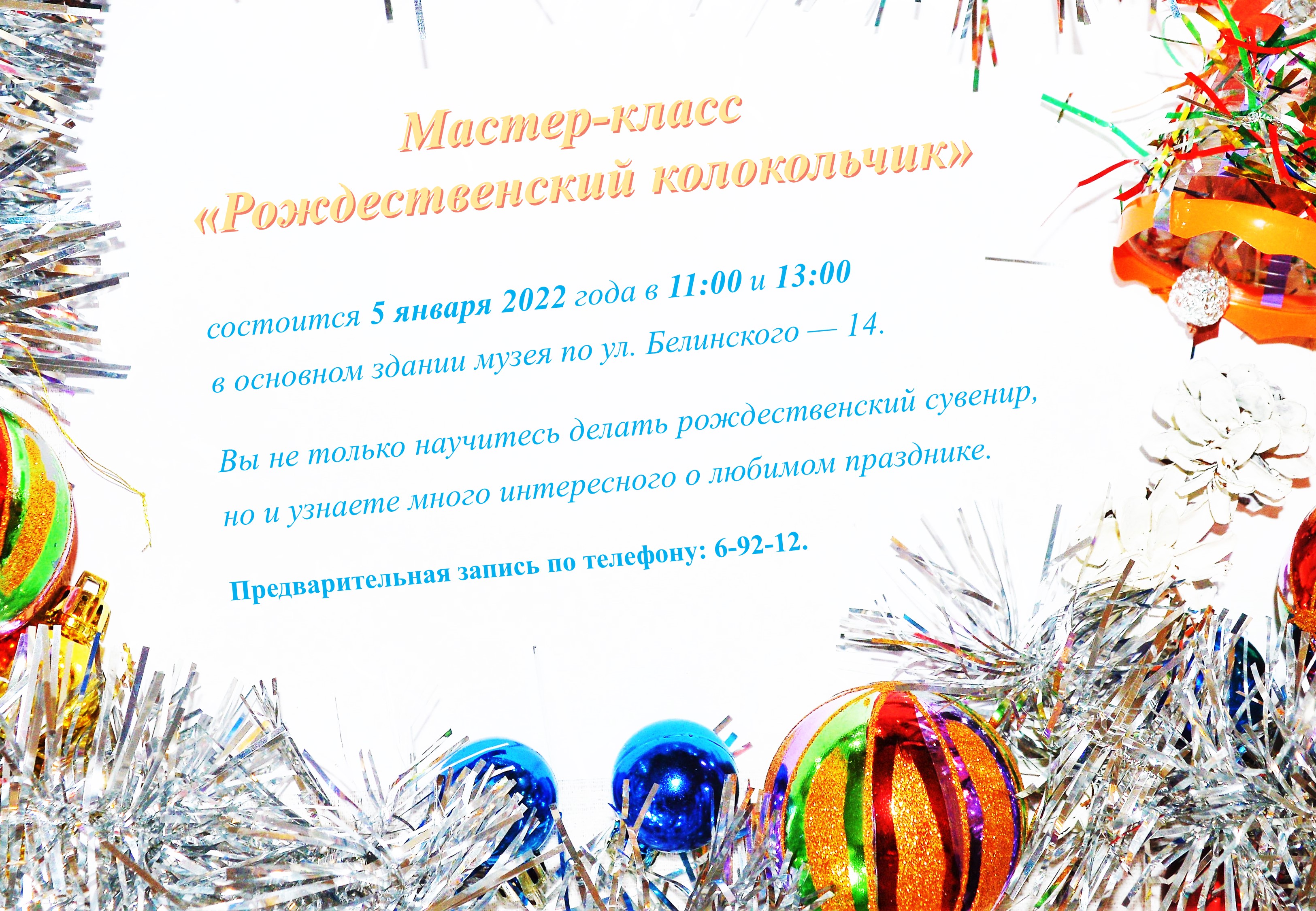 Приглашаем посетить мастер-класс «Рождественский колокольчик», который состоится 5 января 2022 года в 11:00 и 13:00 в основном здании музея по ул. Белинского — 14. Вы не только научитесь делать рождественский сувенир, но и узнаете много интересного о любимом празднике.