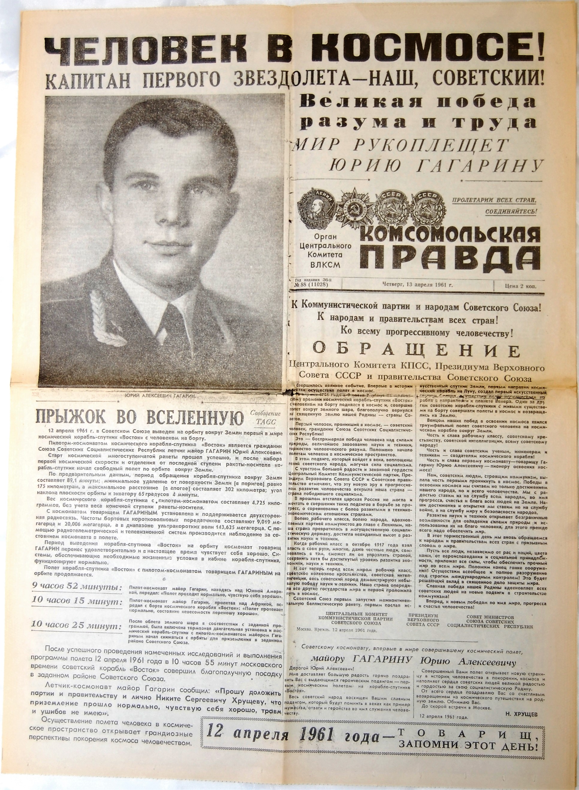 - Газета «Комсомольская правда», №88 от 13 апреля 1961 г. Ордена Ленина типография газеты «Правда» имени И. В. Сталина, г. Москва. Копия.