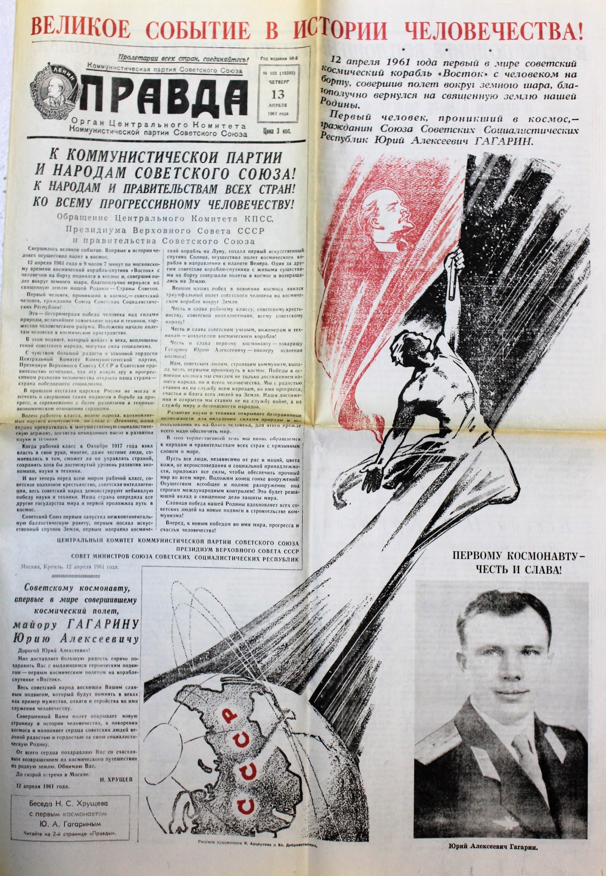 О первом полёте человека в космос говорили на всех радиостанциях, на телевидении и, конечно же, в печатных изданиях. Одними из таких стали газета «Правда» и «Комсомольская правда», которые осветили сенсационную новость уже 13 апреля 1961 года.