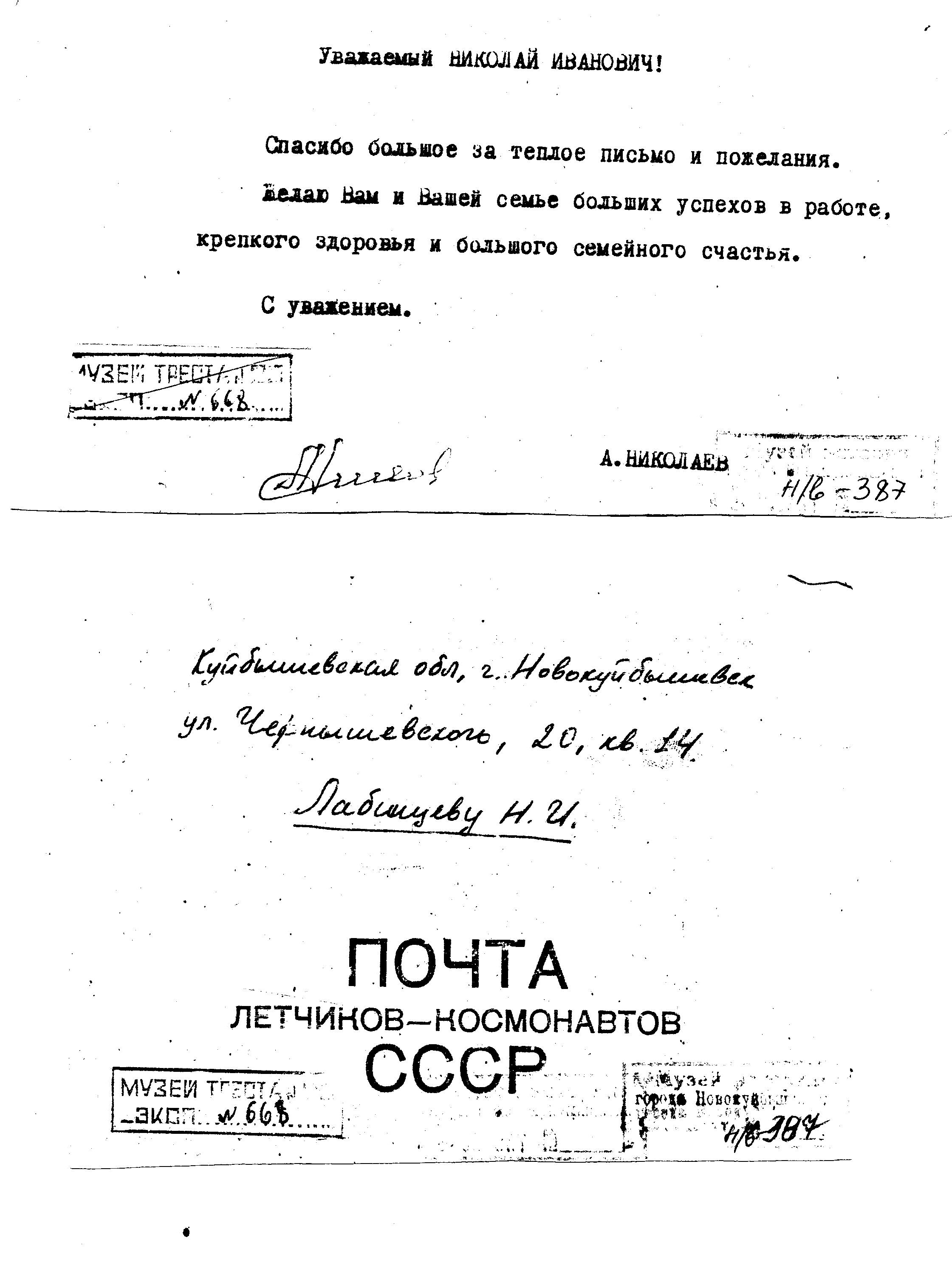 Следующий интересный экспонат — это письмо космонавта Андрияна Николаева нашему земляку Николаю Ивановичу Лабинскому.