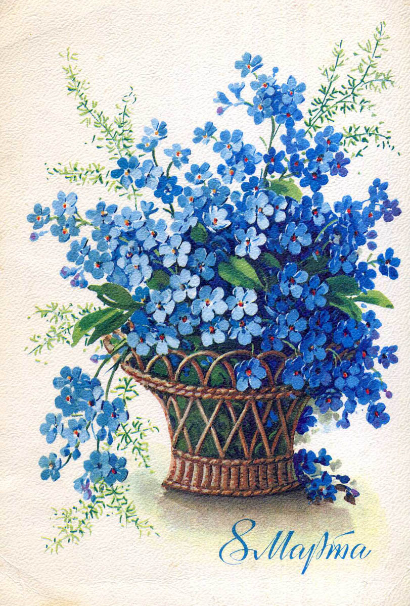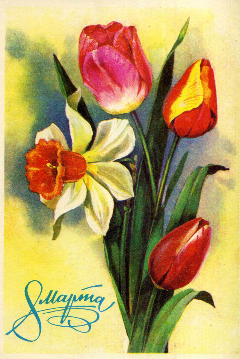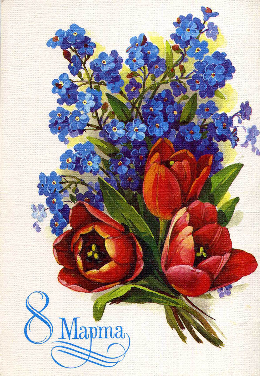Главным и основным сюжетом на открытках к 8 марта были всевозможные букеты, как с ранними весенними цветами — нарциссами, анютиными глазками, тюльпанами, мимозой, ландышами, сиренью, подснежниками, так и с более поздними — розами, лилиями.