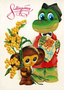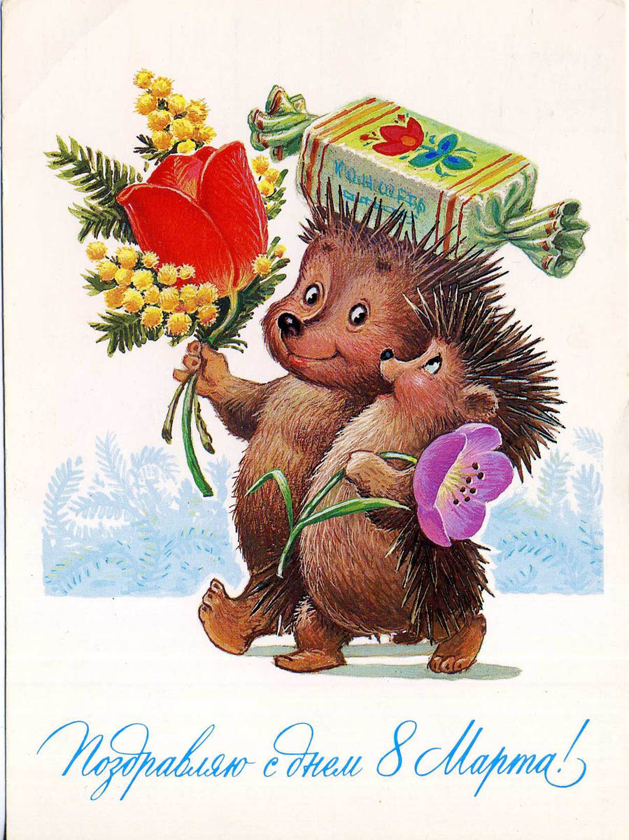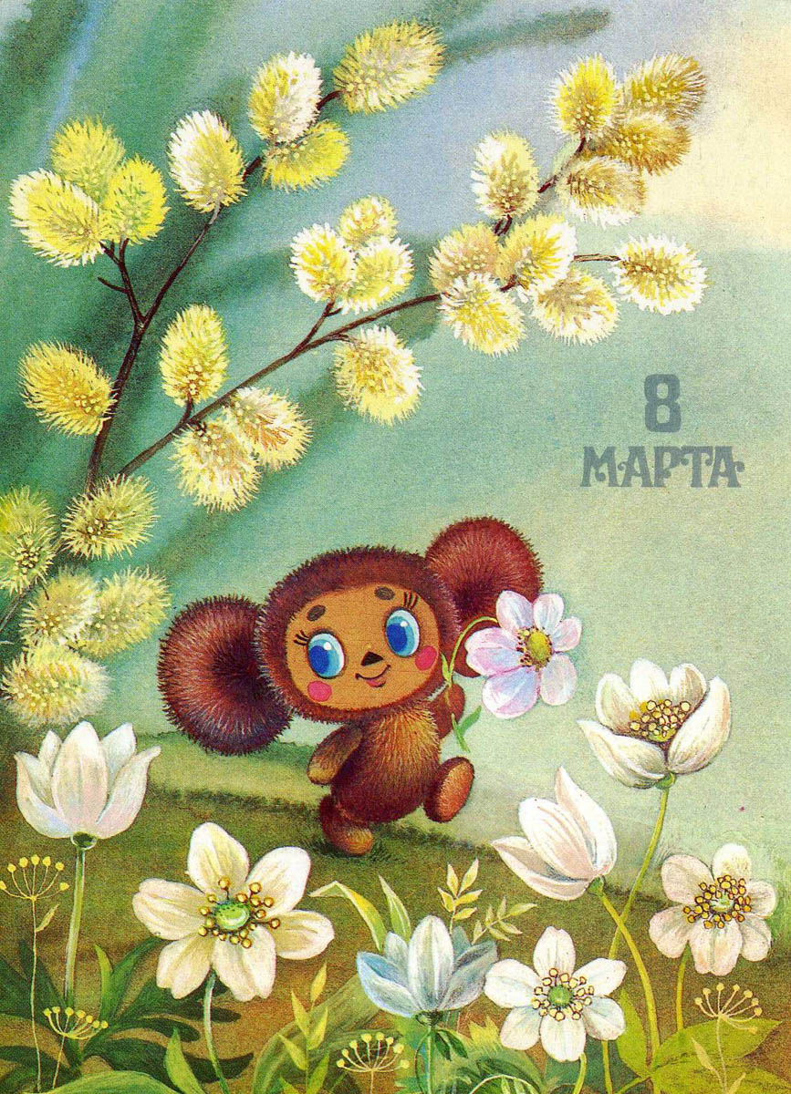 Частыми гостями открыточных иллюстраций к 8 марта были сказочные и мультипликационные герои: Чебурашка, Буратино, Мальвина, Кот в сапогах, мишки, белочки, зайчики, ёжики — все они отличались доброжелательностью и обаянием.
