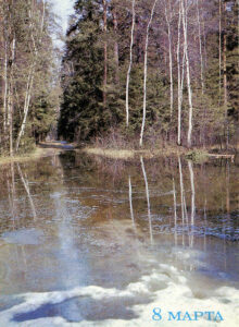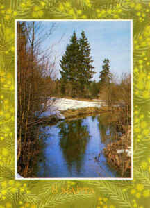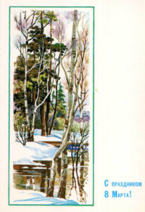 Помимо цветов, на открытках, посвящённых 8 марта, можно было увидеть милые весенние пейзажи. Художники в своих иллюстрациях, посвящённых Международному женскому дню, совмещали 2 темы: весенний пейзаж и букет цветов.