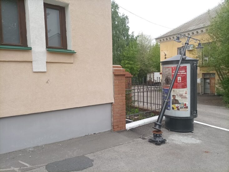 Праздничное утро 9 Мая сотрудникам музея омрачила не только пасмурная погода, но и неожиданный «сюрприз» в виде снесённого фонарного столба у афишной тумбы и повреждённой стены главного здания музея истории г. Новокуйбышевска по ул. Белинского д. 14.