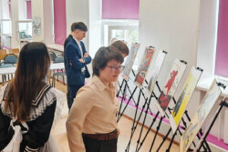 Музей привёз ребятам передвижную выставку военного плаката «На пути к Великой Победе». Пока её устанавливали, актовый зал постепенно наполнялся экскурсантами. На первые ряды подтянулись красавицы-выпускницы в белоснежных фартучках, глядя на которых невольно задумываешься (как ни странно, тема встречи же — война):