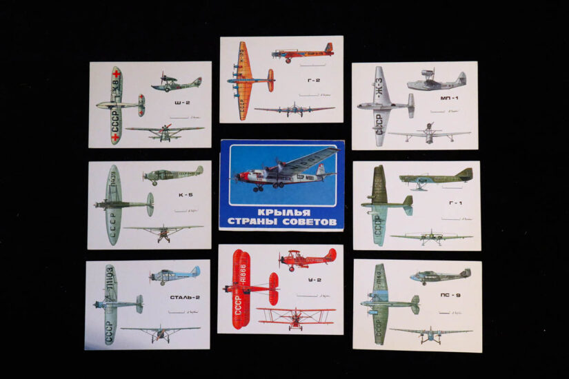 Среди принятых предметов – комплект из шестнадцати открыток «Крылья страны Советов» издательства «Изобразительное искусство» 1990 года, который включает цветные изображения довоенных гражданских и военных самолетов в трех проекциях. К каждой открытке на обратной стороне прилагается историческая справка с анализом моделей и их роли в развитии советской авиации.